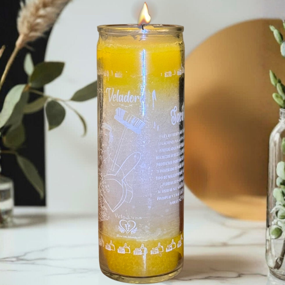 La Veladora "Saca Sal" está diseñada para limpiar energías negativas, alejar la mala suerte y romper hechizos o maldiciones. Su poder purificador disuelve las influencias dañinas, restaura la armonía en el ambiente y protege contra futuros ataques psíquicos.